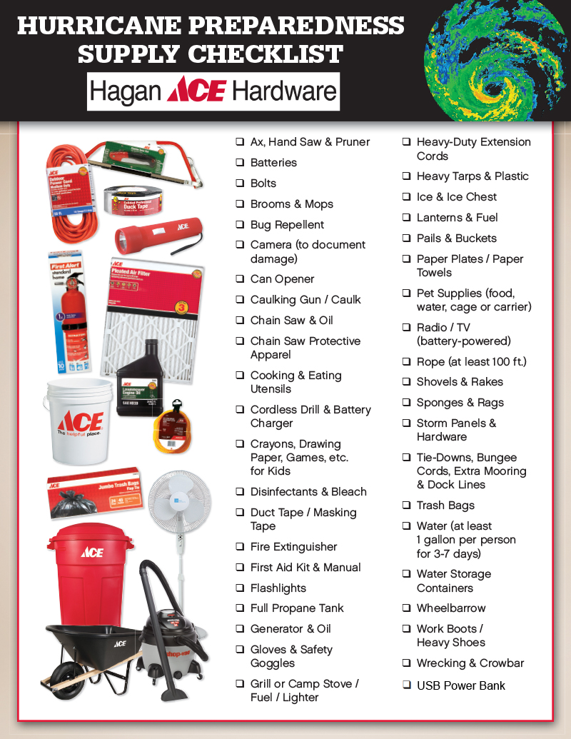 Hagan Ace Hardware stores are stocked and ready to provide many hurricane prep items and essential supplies. Make sure to stop by your neighborhood Hagan Ace Hardware. Click here to find our 11 store locations in Northeast Florida.